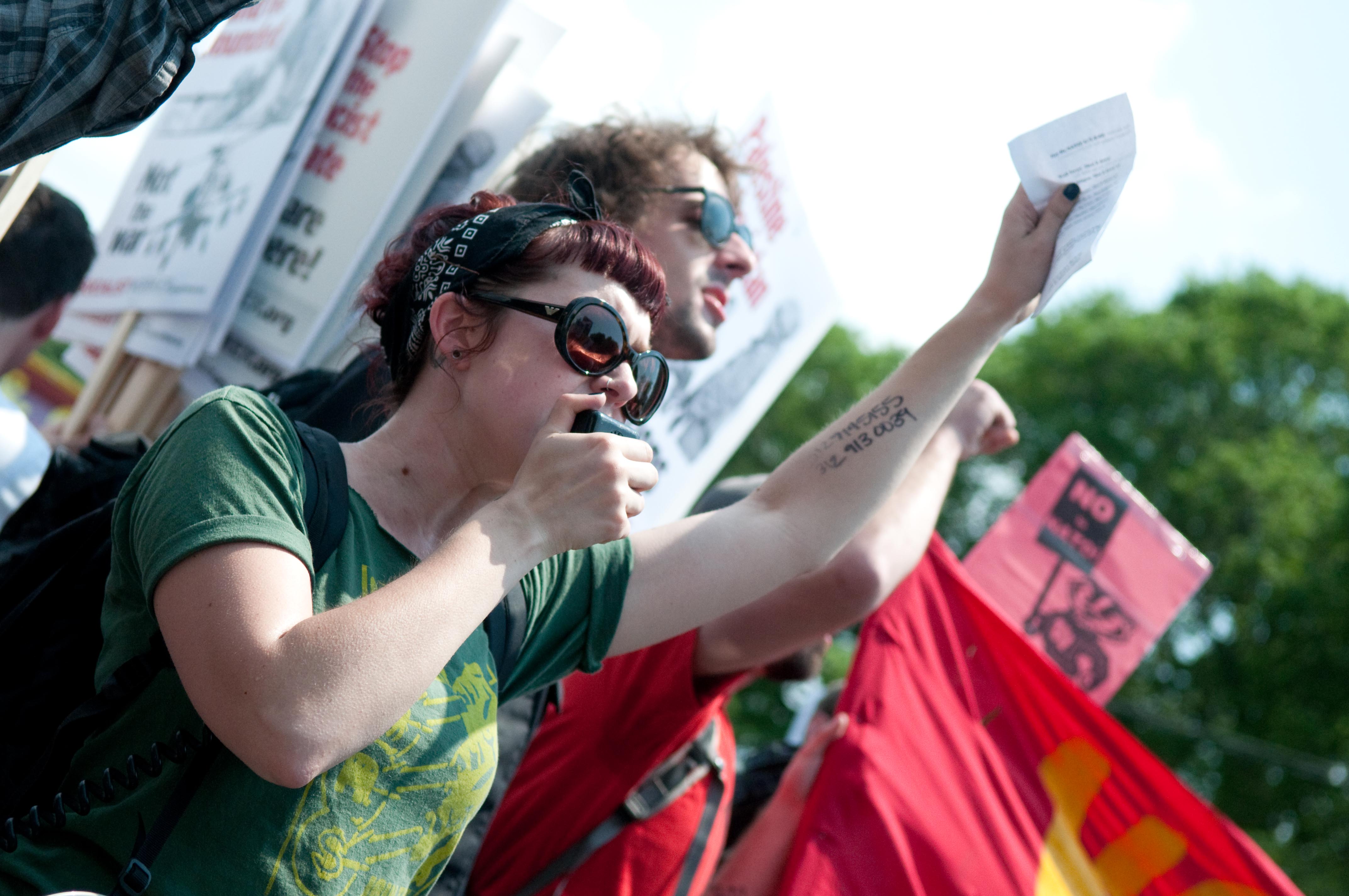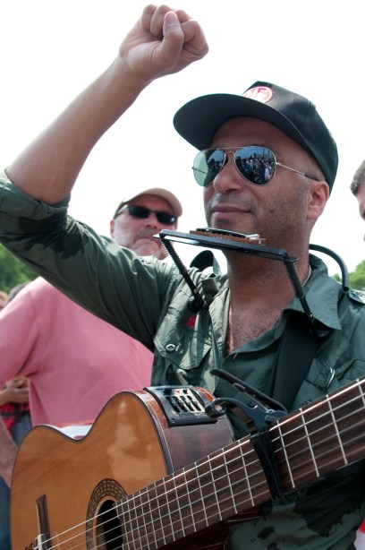 It was already hot late Sunday morning as people began to gather at the Petrillo band shell in Chicago’s Grant Park when Tom Morello of Rage Against the Machine began his set. Eschewing the stage, he performed on the more crowd friendly main floor as a group of veterans against the war held back the spectators. Beside the performance area, news media crews set up their equipment, each accompanied by at least two hired security guards. A handful of police strolled through observing the scene. As the temperature increased the protesters, now arriving singly and in large groups collected in the shade. Walking through the gathering groups it was difficult to get a sense for the overall message. Communists, the occupy movement, corn subsidy opposition, US veterans against the war, and anti-drone war activists (complete with hand made replicas) each set up meeting points one after the other with the songs of the Hare Krishna’s droning in the background.