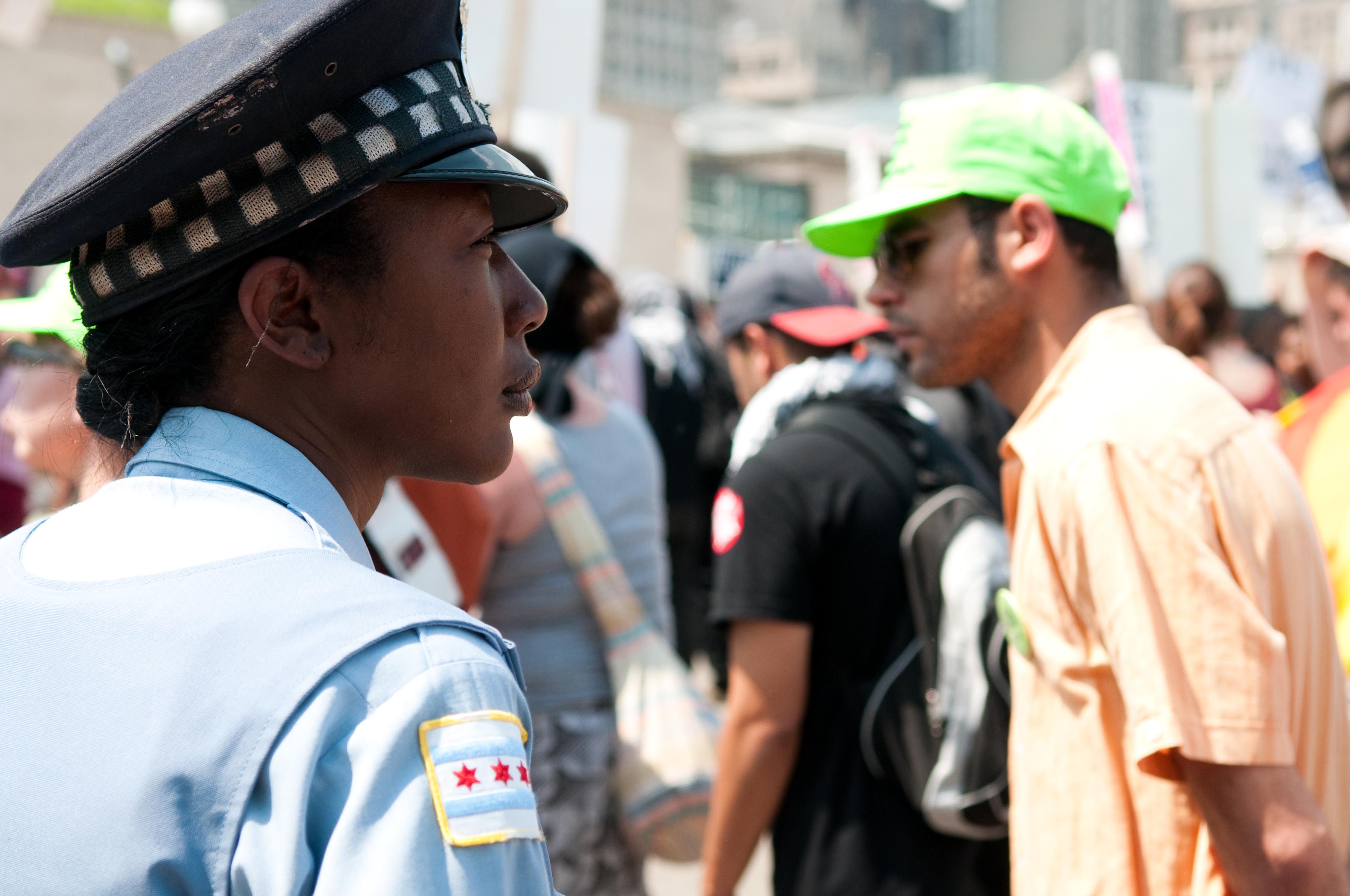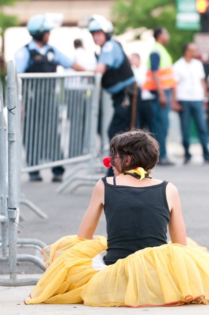 As the sequestered protesters and cops stared each other down in the heat, there began a conversation. A young demonstrator began chiding some officers for being on the wrong side of the protest. He argued that before too long, the police would feel the 1% reach into their lives and pocketbooks as well. Surprisingly, one of the officers responded. What unfolded was a dialogue between establishment and change agitator. As it turned out, they were both Chicago public servants. One was a police sergeant, and the other a public school teacher. These conversations are what many in the crowd possibly hoped for on some level…to be heard by individuals in the establishment, instead of roughed up, chased away or arrested. This continued for several minutes until another demonstrator happened by and saw an opportunity to verbally abuse the officer. At this, the others involved quickly lost interest and returned to their silent vigil. Which was how the event ended. Demonstrators moved away by twos and threes, while police descended on the nearby White Castle for sliders and Cokes.