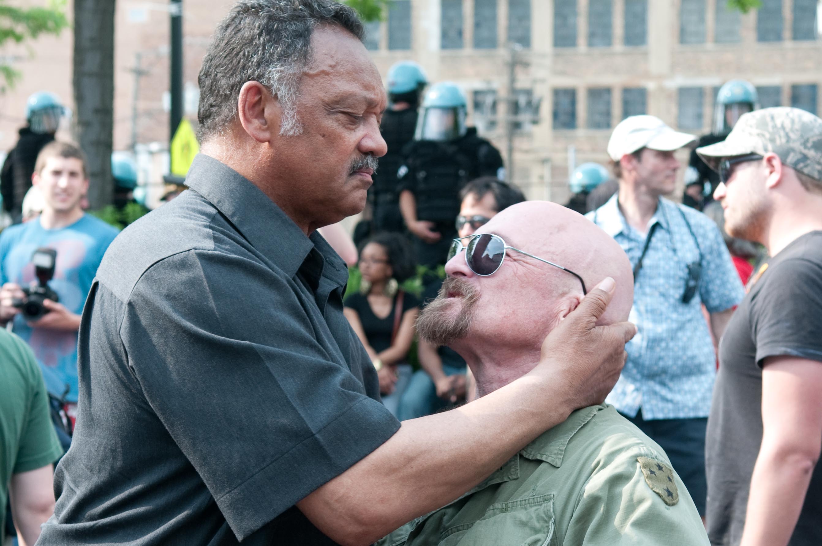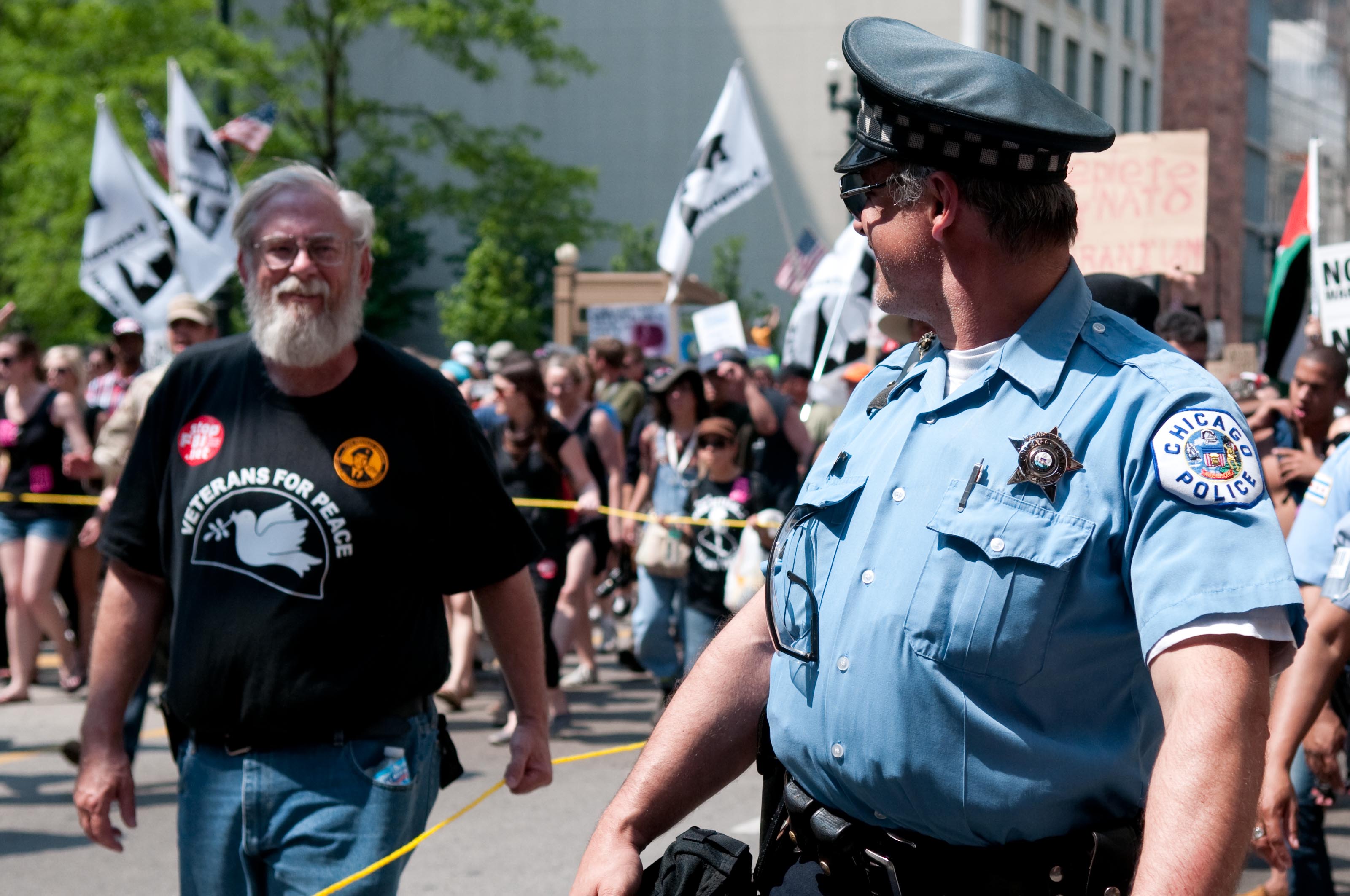 As the sun beat down and the temperature moving into the 90’s, the march got underway with Rev. Jesse Jackson and the group of veterans leading the way. They were followed by each of the other disparate groups one after the other. The entire march was hemmed in on both sides by a solid blue line of police officers. As this river of shouting, flag waving humanity moved through the streets with chants and slogans filling the air…it seemed that for every heavily documented shoving and shouting match with police there was a joke or conversation between those in uniform and those without that went unnoticed and unrecorded. The march ended in front of a small stage set up at the nearest intersection to McCormack Center. During a presentation by Afghani women who had witnessed the horrors of war in their homeland, a local artist erected his portable easel and created an oil painting of the scene. Afterwards, groups of veterans came to the platform to share their stories and reasons for discarding their War on Terror campaign ribbons, which were then thrown over the police line towards the convention center. Only a few of these men and women had visible physical scars to match their fresh emotional wounds.