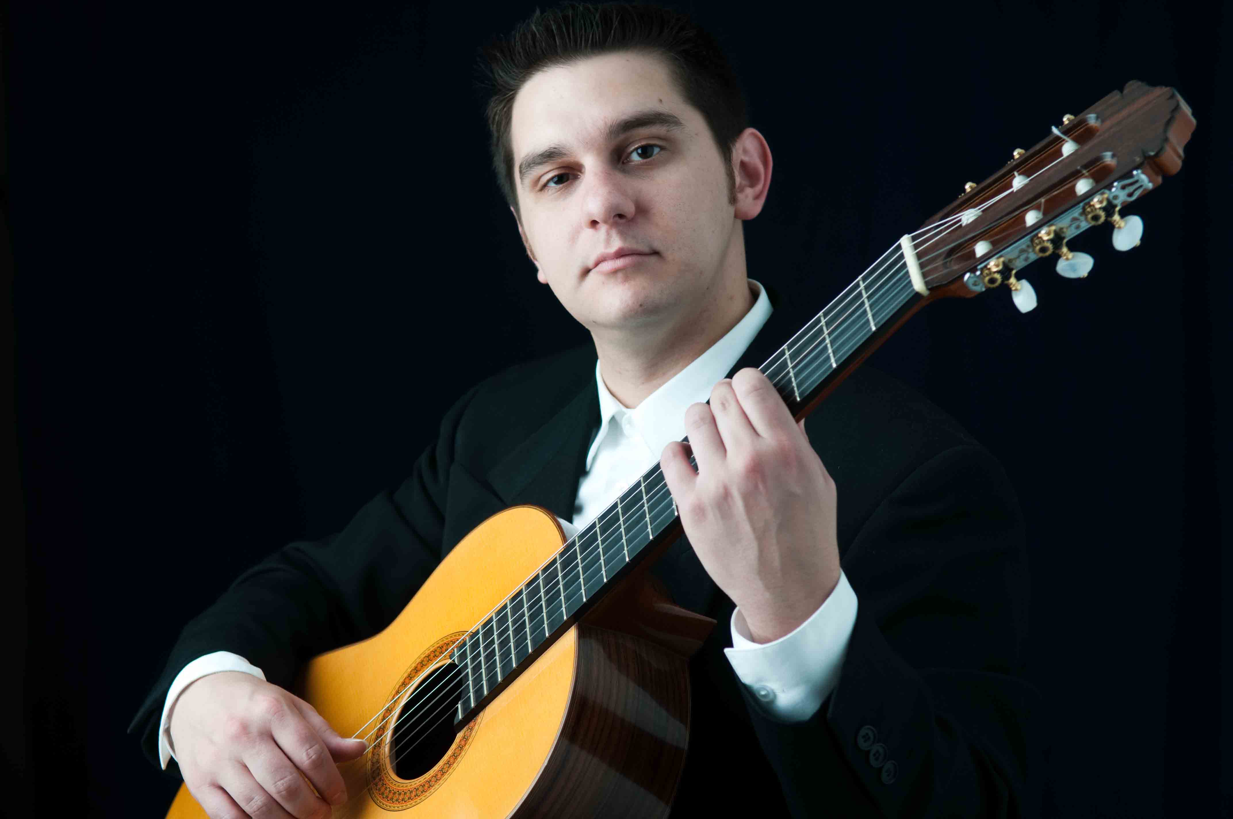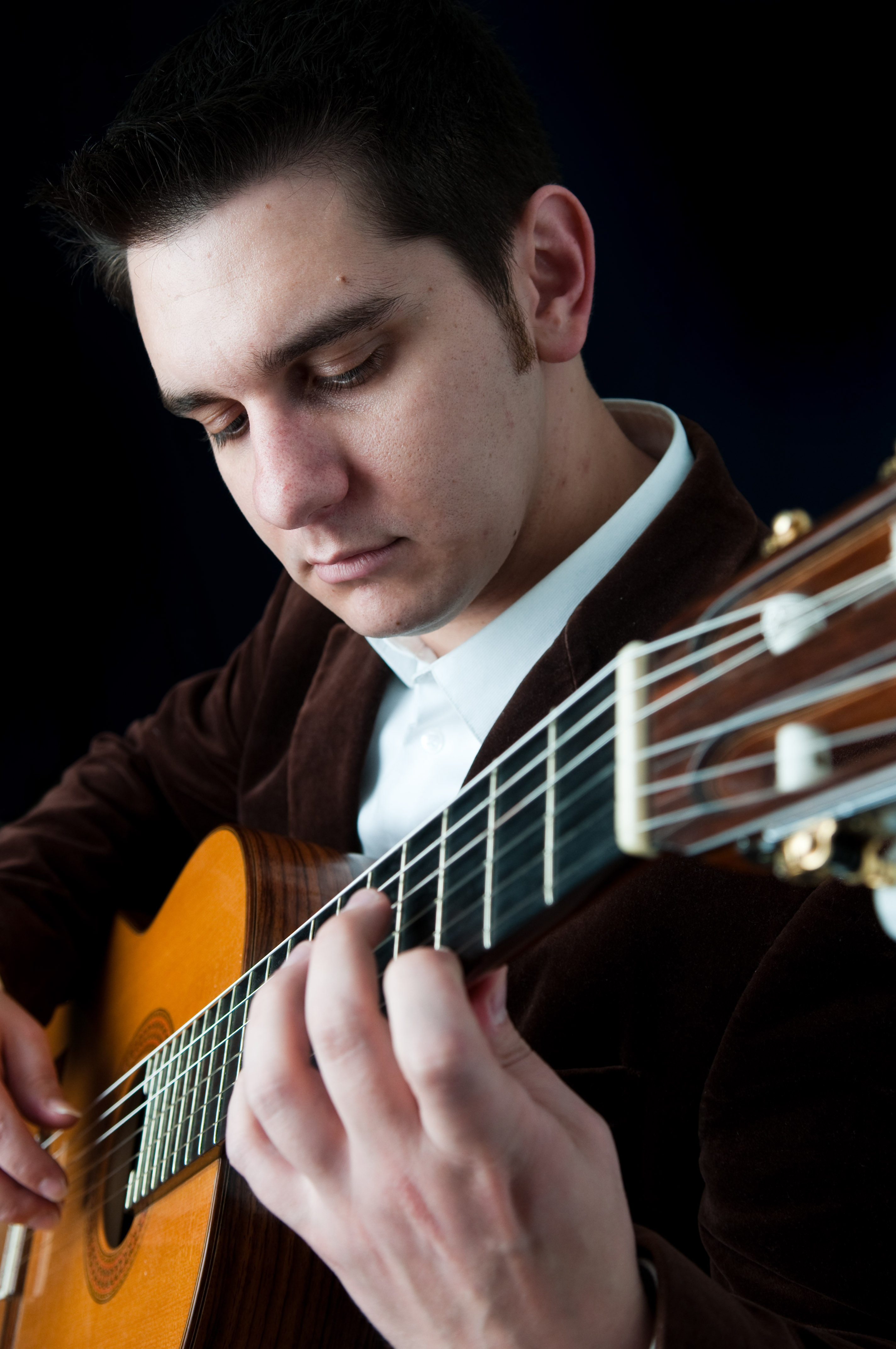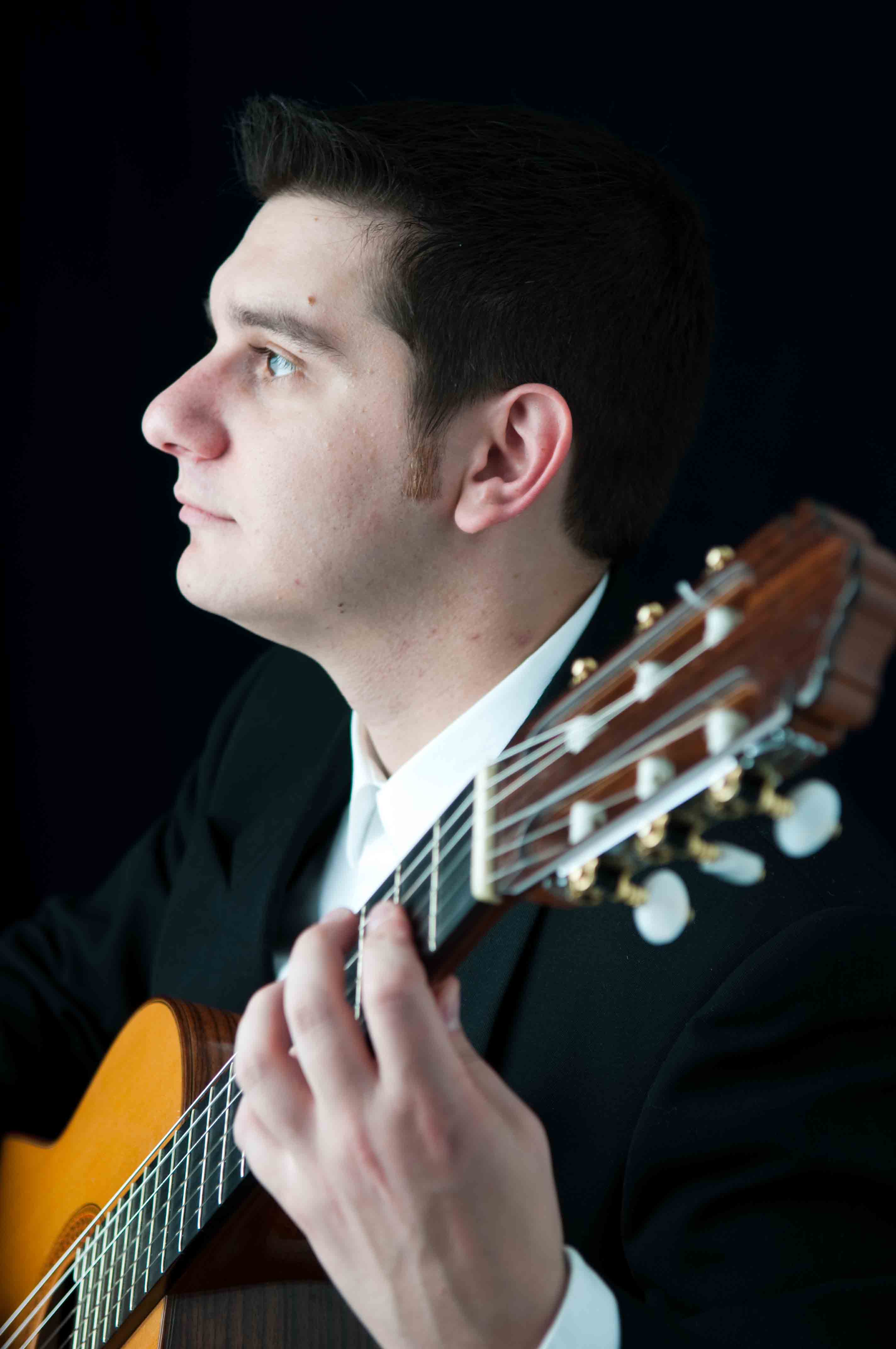 Recently, had a portrait session with local musician Adam Babaric. We had agreed on a basic look that would be classy and professional, and also portray the warm and intimate atmosphere, which he hopes to provide for his clients. As I did a final check of lighting and exposure, Adam began to play Lagrima by Torroba. With a dark studio space and Adam lit only by the modeling light playing a beautiful classical guitar piece completed the mood for a beautiful session.