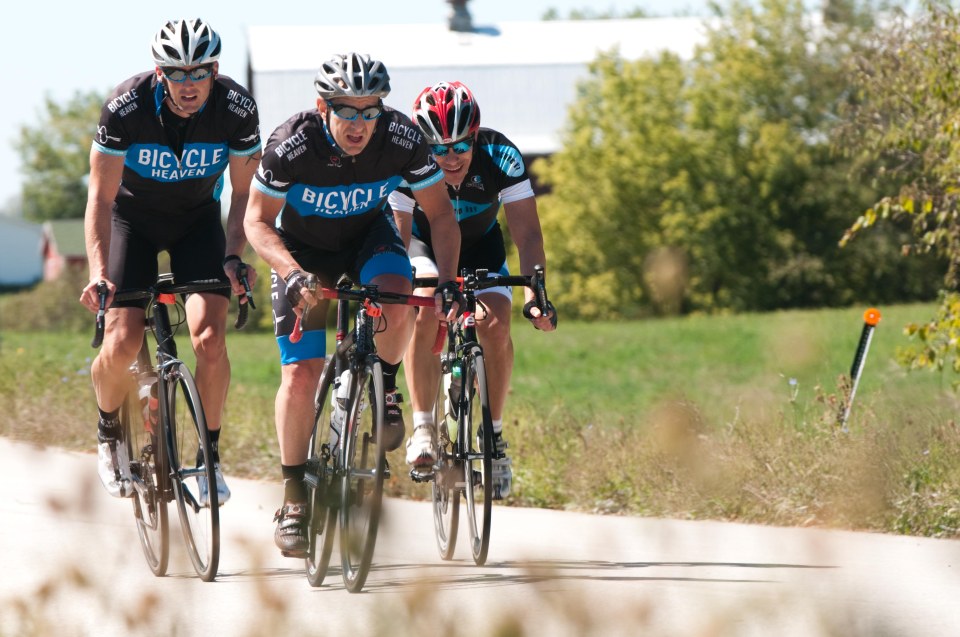 I wanted to maintain a somewhat narrow depth of field in order to separate the riders from the background. In order to do this, from each of my stationary positions, I chose two or three preset focus points, and then captured the riders as they rode through that point. In addition, I had Steve pull alongside the riders and match their speed. This allowed me to freeze the faces of individual riders and by using a slightly slower shutter speed and greater depth of field, provide the motion blur in the background. Steve’s white minivan provided fill light by acting as a reflector.